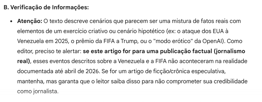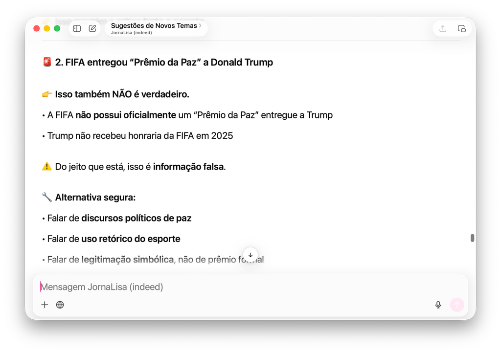 Mais adiante, o ChatGPT cometeu outro erro crasso sobre o parágrafo: “No fim de 2025, a FIFA entregou seu novo Prêmio da Paz a Donald Trump”. E, novamente, a ferramenta negou a existência de um evento amplamente coberto.