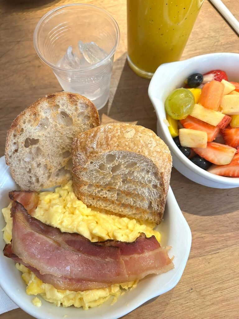 Mas o verdadeiro destaque está em seu cardápio, onde na primeira visita optei em pedir o combo clássico de café expresso duplo, ovos mexidos com bacon e salada de frutas, que saiu por R$49,50. Na ocasião, troquei o café pelo suco “amarelo”, que é feito com manga, maracujá e gengibre.