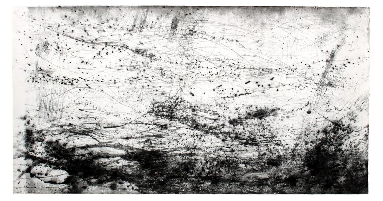 “Quando falamos de manchas nesse conjunto de obras, devemos pensar em tudo aquilo que na matriz da gravura encontra seus contornos de forma livre, pelo gesto ou pela técnica”, destaca Soler.