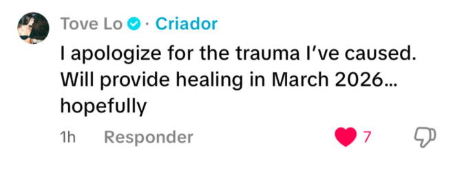 Leia também: Netflix divulga novo teaser do documentário “BTS: O Reencontro”: Tove Lo confirma que seu novo álbum está sendo finalizado e deve ser lançado no 2º semestre deste 2026Dias antes, Tove Lo já havia despertado a curiosidade dos fãs ao mencionar, em comentários publicados em sua conta no TikTok, que preparava novidades para março de 2026. À época, especulava-se o lançamento de um novo single, mas as publicações mais recentes reforçam que se trata de um novo álbum completo.