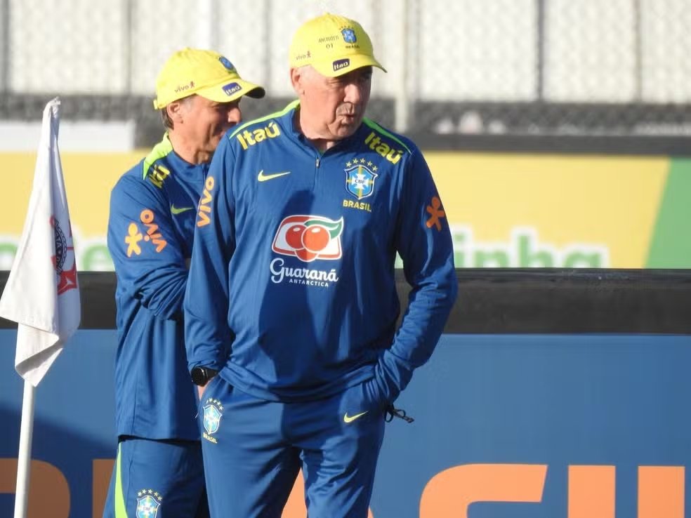 Em trabalho tático no CT do Corinthians, Carlo Ancelotti armou a Seleção para enfrentar o Equador num 4-3-3, com um triângulo invertido no meio. Sem a bola, o time se fecha num 4-4-2. Entre os jogadores, alguns velhos conhecidos do treinador, como: Richarlison, nos tempos de Everton-ING, Casemiro (Real Madrid) e até então, Vini Jr. com quem esteve dividindo o dia a dia nos últimos anos.