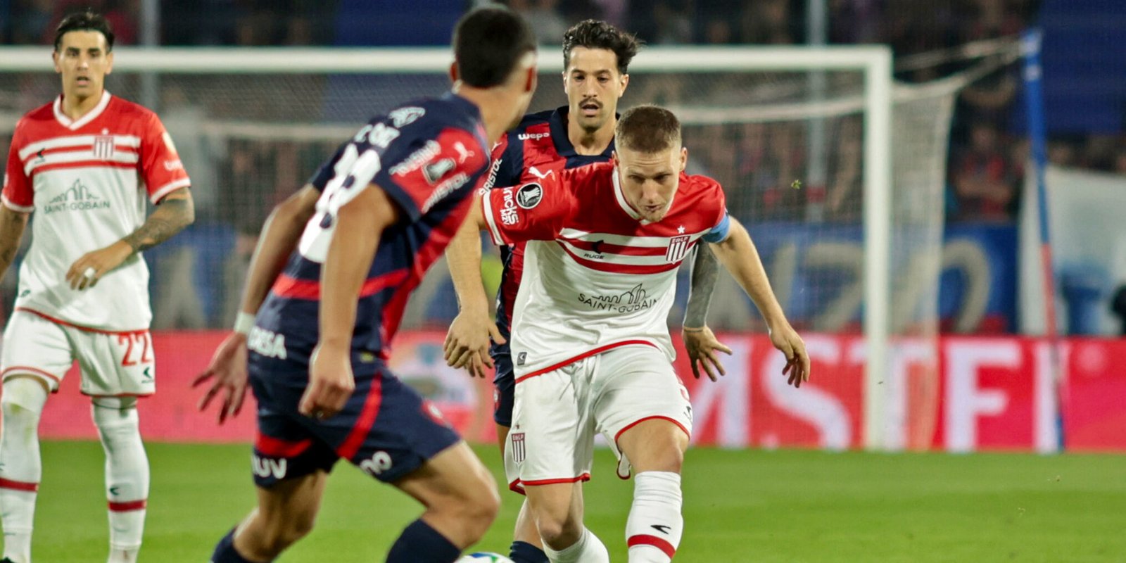 Fabricio Domínguez, lateral de origem escalado como meia-direita, foi um dos principais articuladores das jogadas ofensivas do Cerro na primeira etapa. O confronto seguiu concentrado na faixa central, com as equipes trocando poucas posses e finalizando raramente. O Estudiantes soube se defender com eficiência e conseguiu trocar mais passes no campo adversário, algo que não havia feito até então. A etapa inicial foi marcada por poucas faltas e raras paralisações, terminando em um 0 a 0 morno.