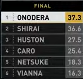 Netsuke começou bem, com uma manobra que valeu “9.2”, no entanto, não conseguiu somar mais notas e ficou fora do pódio. Nyjah também começou bem, mas caiu na última manobra e selou a terceira colocação. Shirai chegou a assumir a liderança na última manobra individual, mas ficou na segunda colocação após Onodera conquistar uma “nine club” e passar a frente e se tornar campeão.