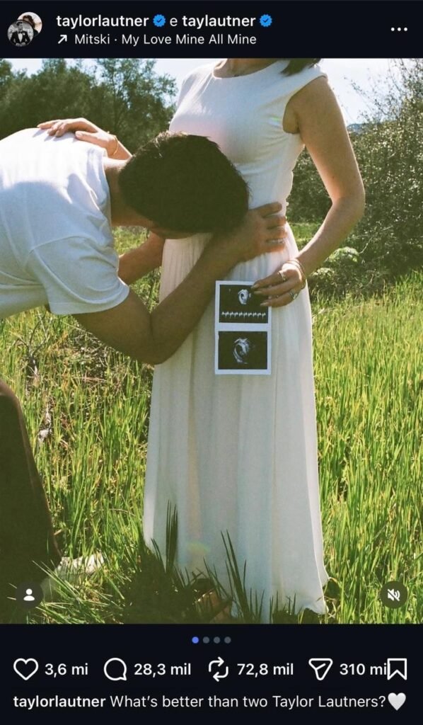 O ator Taylor Lautner (34) revelou, por meio de suas redes sociais, que será pai pela primeira vez. O anúncio foi feito nesta quinta-feira (26), onde o artista apareceu ao lado da esposa, a enfermeira Taylor Dome – que passou a se chamar Taylor Lautner após o casamento, em um ensaio fotográfico postado no Instagram.