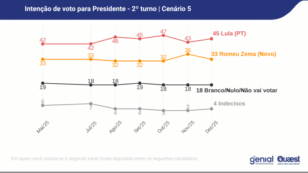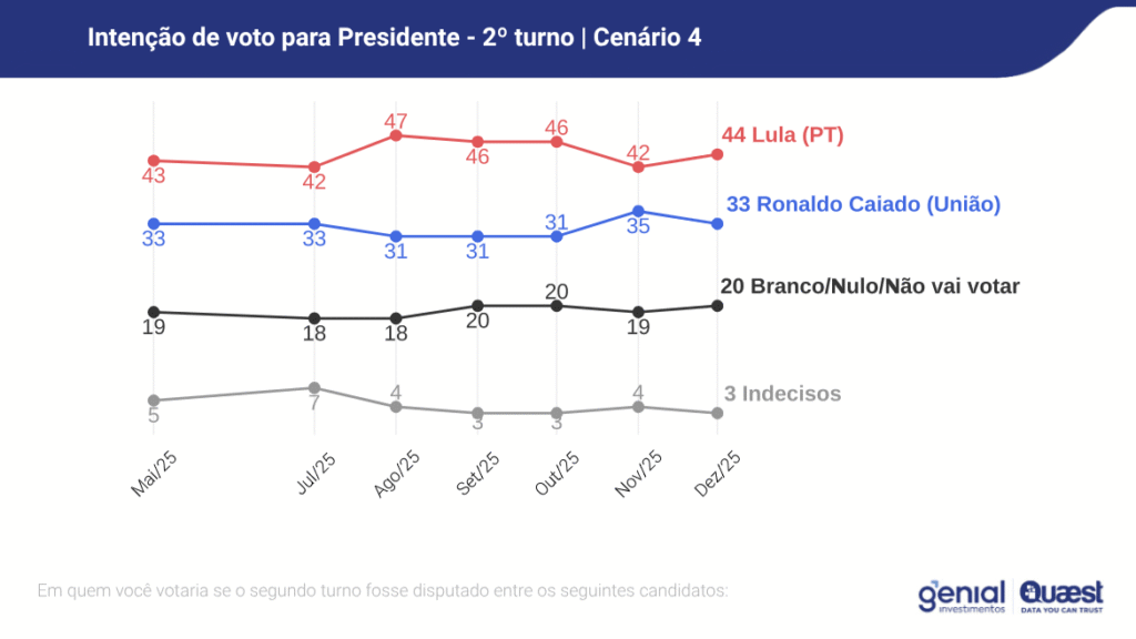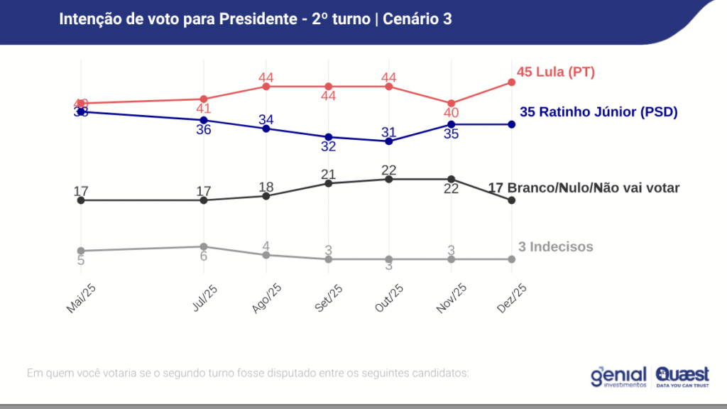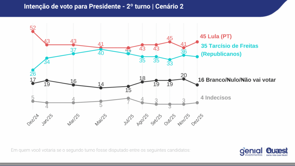 A pesquisa ouviu 2.004 pessoas, nos dias 11 a 14 de dezembro, com 16 anos ou mais. A margem de erro é estimada em 2 pontos percentuais, e tem 95% de confiança.