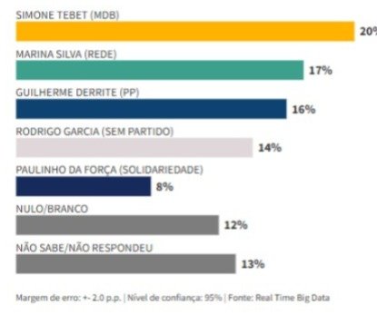 - Cenário sem Guilherme Derrite: Tebet atinge seu melhor desempenho, com 20%, contra 10% de Mário Frias (PL).
